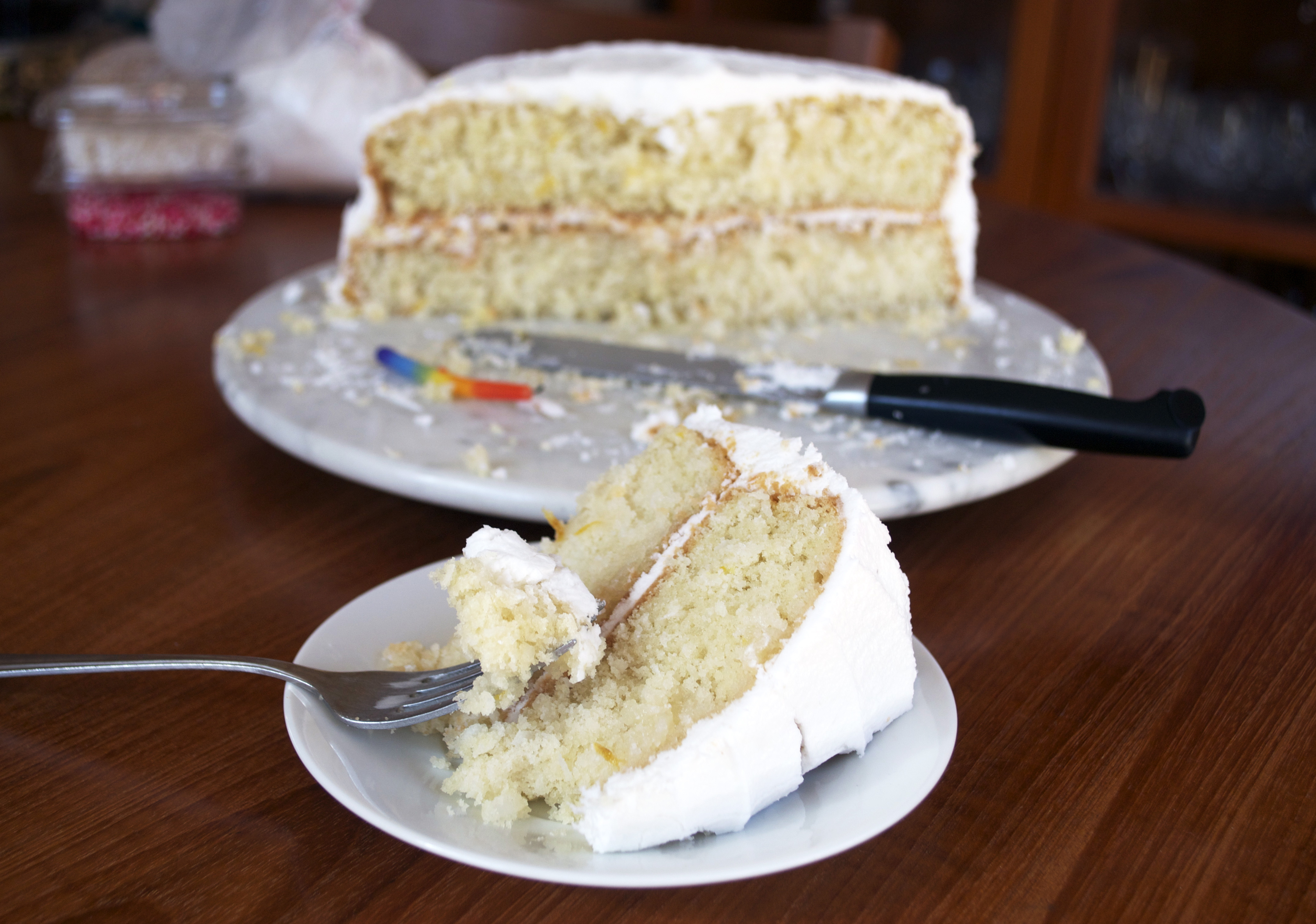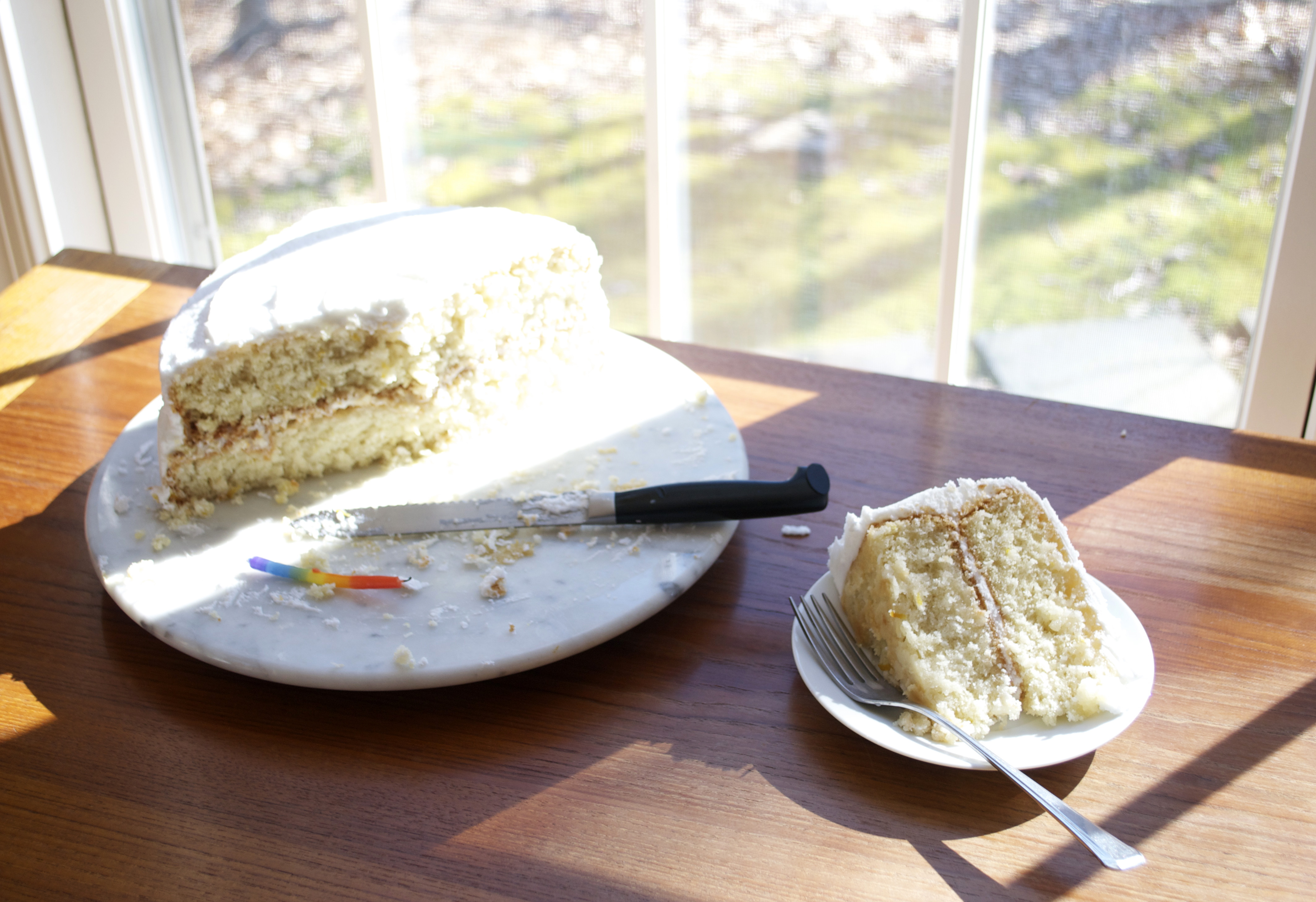 Anyway, the major point here is that the cake was delicious and every person who ate it Saturday night agreed. These cake-eaters were all non-vegans by the way (besides Stephen). It was moist, it was coconuty & lemony, the frosting was fluffy. It was pretty damn good if I do say so myself. Dad & Stephen both had seconds. As only my second attempt at a vegan cake thus far, I couldn’t have hope for better and it’ll definitely be hard to top.