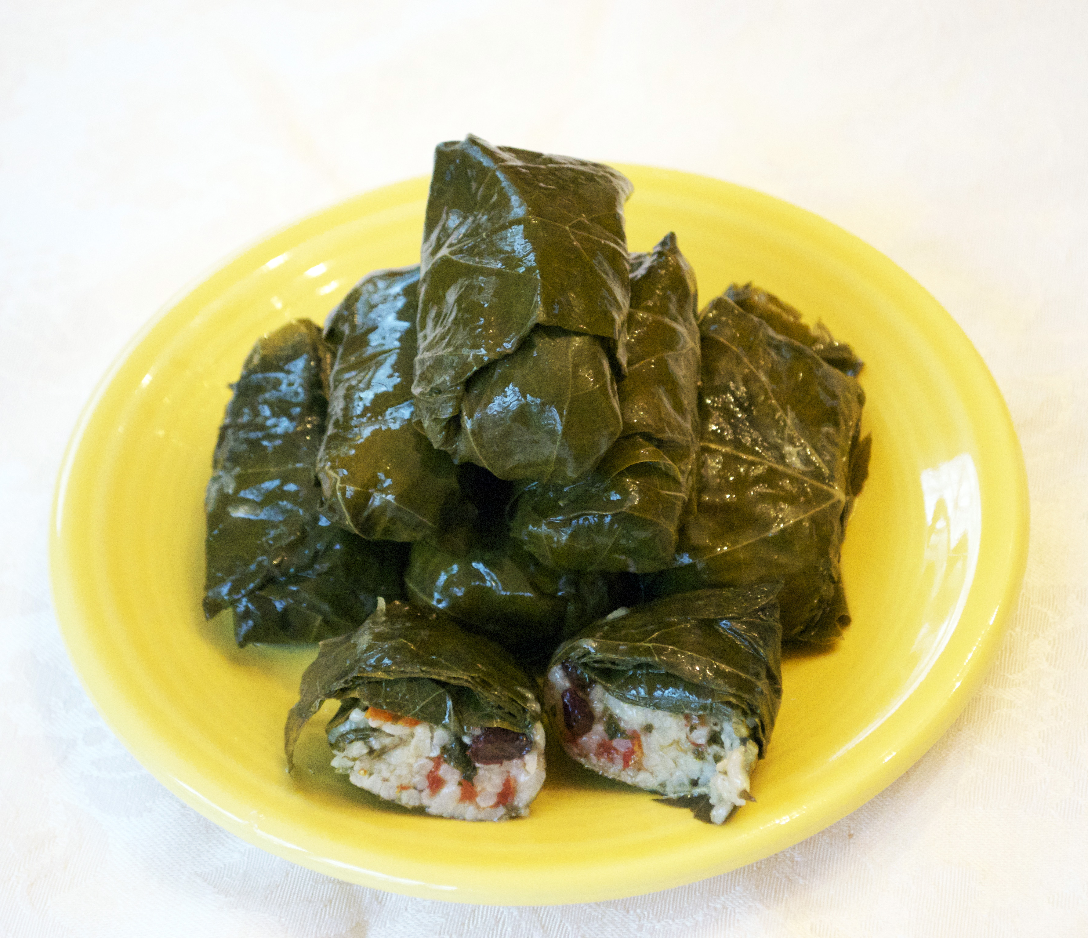 If my directions make absolutely no sense because I am completely incompetent at explaining kitchen techniques… I’m more of a teach by show kinda gal…. there is a wonderful series of pictures at SouSou Kitchen that show the steps to rolling a grape leaf…. I suggest you visit the site since I don’t even think I understand what I’m explaining. Maybe it’s because it’s really quite simple – I swear!
