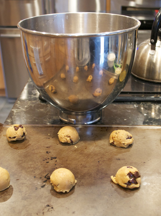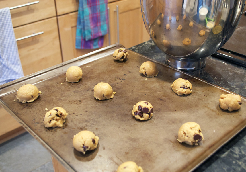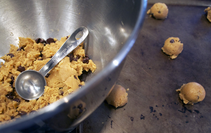 Using a tablespoon, scoop the dough out of the bowl placing about a dozen mounds on each baking sheet.