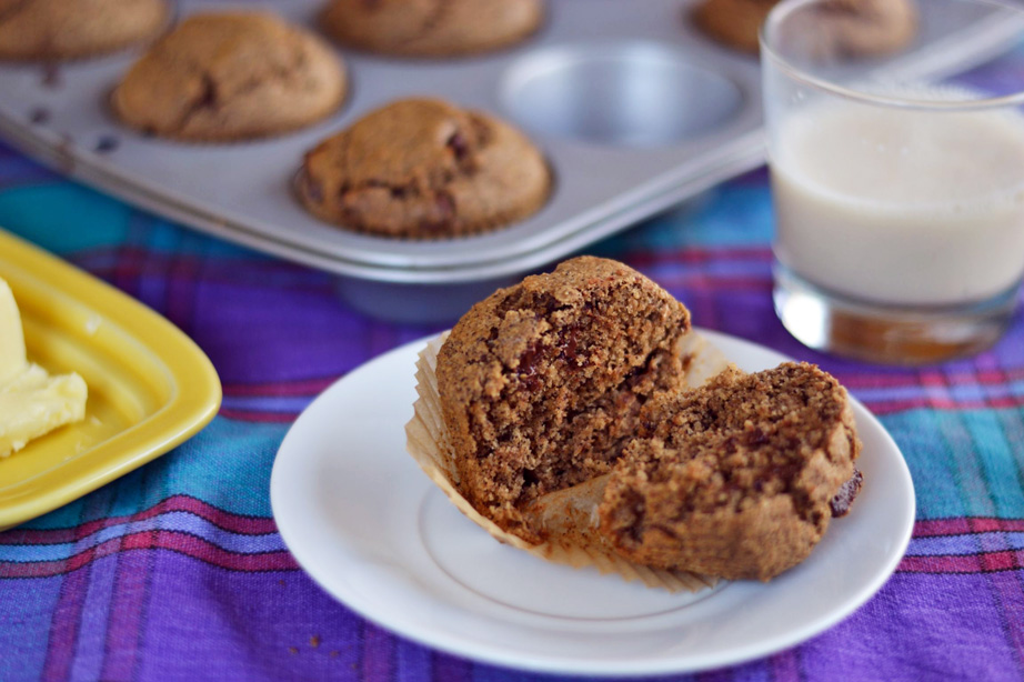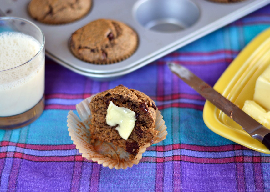 *I used dairy-free chocolate – half Ghirardelli Semisweet Chocolate Chips & half chopped Ibarro Mexican Chocolate. The Mexican chocolate is full of granulated sugar & adds a nice sugary crunch to the muffins.  Feel free to use as much chocolate, or little as you like – keeping in mind that it may affect the volume of the batter.